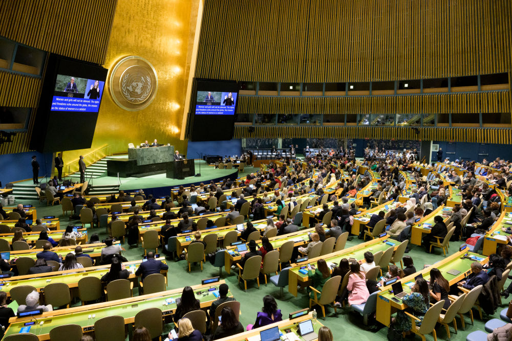 ↑3月6日,在位于纽约的联合国总部,联合国秘书长古特雷斯在联合国妇女地位委员会第67届会议开幕式上致辞。