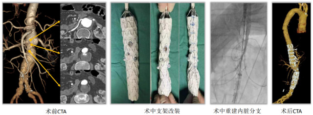“主动脉是人体内最大的血管,这根血管负责向全身输送动脉血,现在这根血管的内膜发生了破裂,薄薄的外膜无法抵挡主动脉内的压力,已呈瘤样扩张,随时有可能破裂大出血导致患者死亡。更要命的是,主动脉的破口位于主动脉的内脏分支区,在修复主动脉的同时必须要重建腹腔内脏的动脉血供,这给范先生的治疗带来了极大的挑战。”血管外科主任王伟教授介绍,既往针对胸腹主动脉瘤或是累及内脏分支的主动脉夹层动脉瘤,需要做胸腹联合切口,伤口接近1米,号称人体上最大的手术切口,创伤极大。且由于需要更换主动脉,术中出血多,术后并发症率高,恢复时间长,很多高龄体弱的患者根本无法耐受这样的大手术。