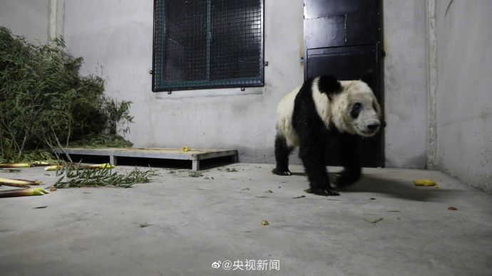 图为“丫丫”在上海隔离检疫圈舍内,旁边的竹子堆成小山。