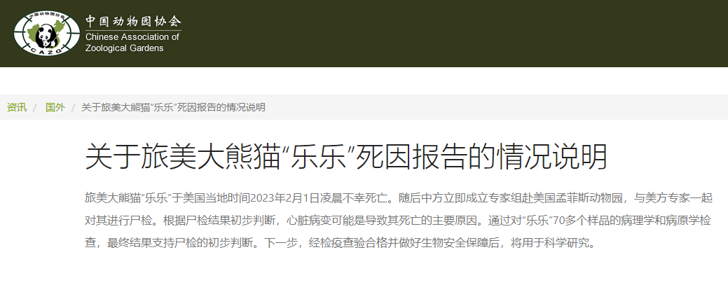 关于旅美大熊猫“乐乐”死因报告的情况说明