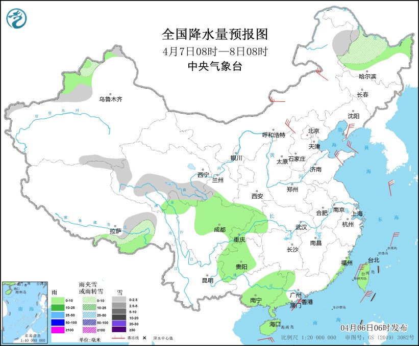 4月6日08时至7日08时,内蒙古东北部、黑龙江西北部、新疆南疆西部山区、西藏北部和东部、青海南部和西部、川西高原北部等地部分地区有小雪或雨夹雪,其中,内蒙古东北部、黑龙江西北部等地部分地区有中到大雪(5~8毫米)。黑龙江东部、西藏东南部、河北东南部、天津、山东中北部、西南地区东部、江南、华南等地部分地区有小到中雨,其中,广东沿海地区、福建东南部等地部分地区有大雨(25~45毫米)。内蒙古中北部部分地区有4~6级风(见图1)。渤海、渤海海峡、黄海中北部、东海北部和南部、台湾以东洋面、北部湾将有5~7级风,阵风8级。