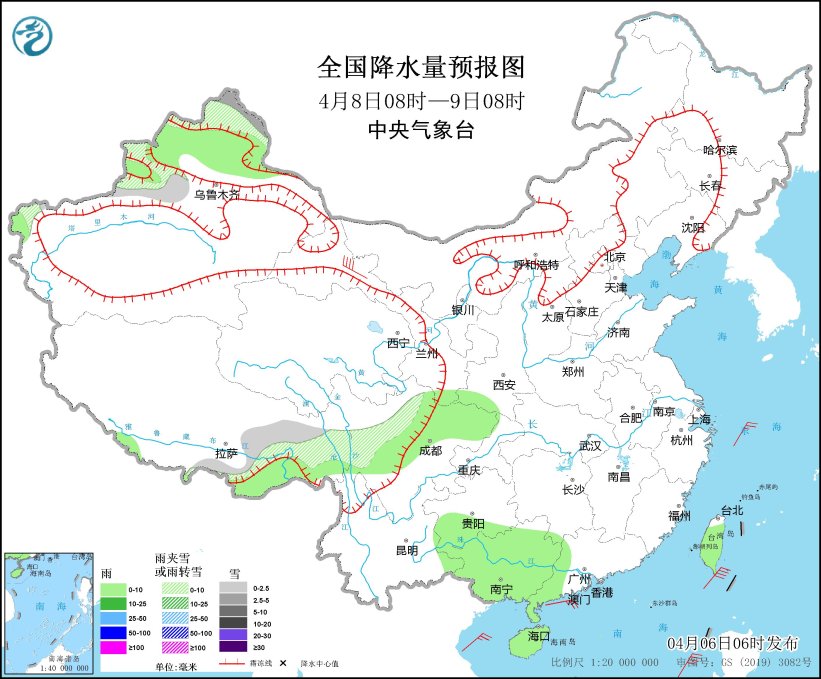 4月8日08时至9日08时,新疆北疆北部、西藏南部和东部、川西高原北部等地部分地区有小到中雪或雨夹雪。新疆北疆东部和沿天山地区、西藏南部、四川盆地北部、贵州南部、广西、广东西部、海南岛、台湾岛等地部分地区有小雨。甘肃河西部分地区有6~7级风(见图3)。东海南部、南海东北部、台湾海峡、巴士海峡、台湾以东洋面将有5~7级风,阵风8~9级。