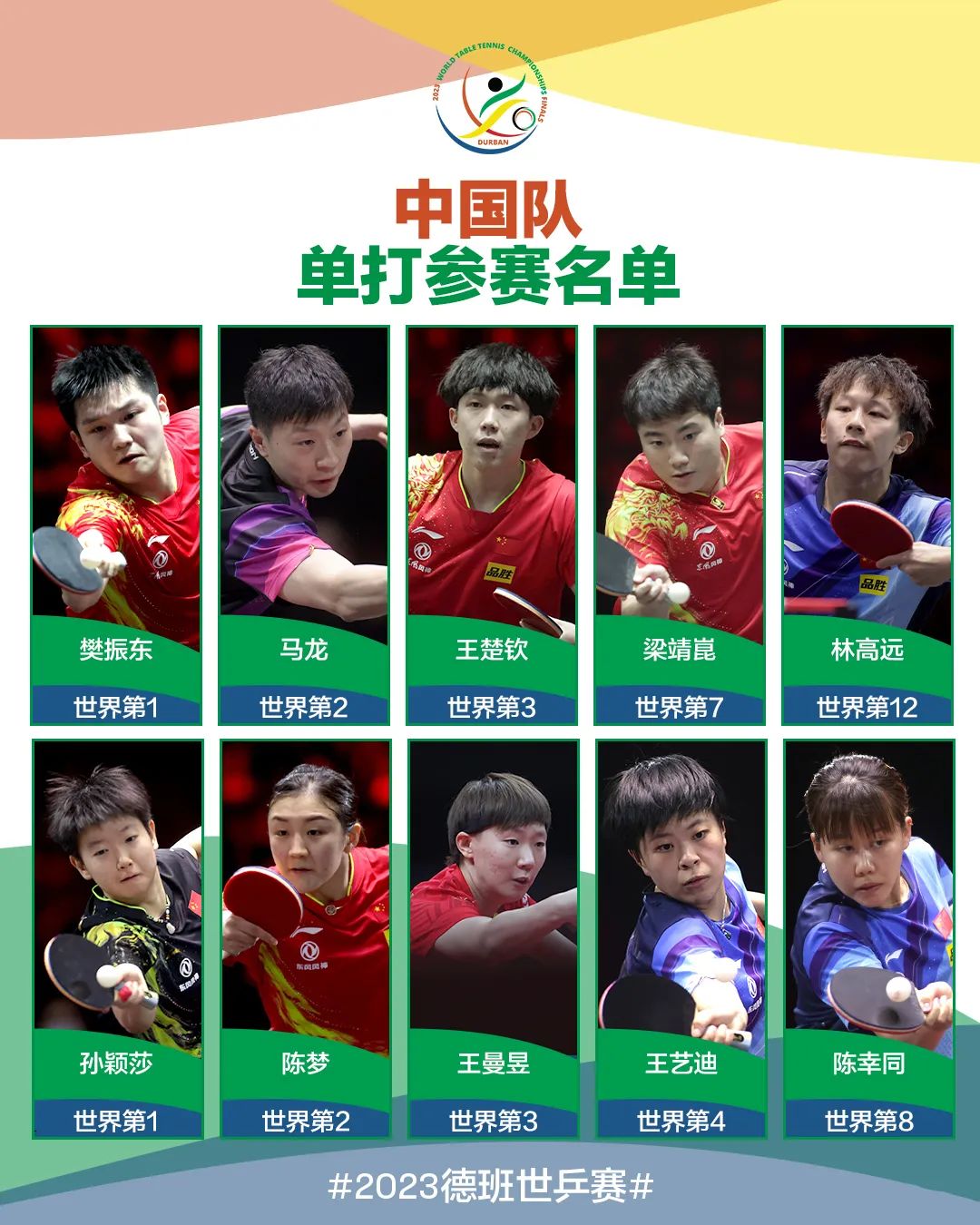 2023德班世界乒乓球锦标赛决赛将于5月20日至28日在南非德班举行。以下为中国乒乓球队参赛名单: