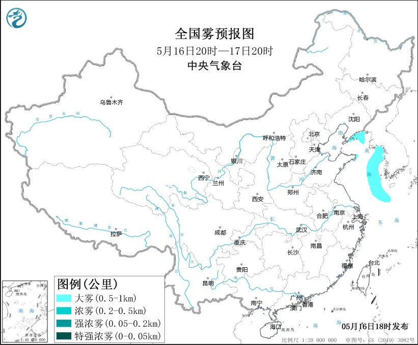 预计,5月16日夜间至17日白天,辽东半岛东部沿岸海域、山东半岛东部沿岸海域、黄海东部海域、东海北部部分海域将有能见度不足1公里的大雾。