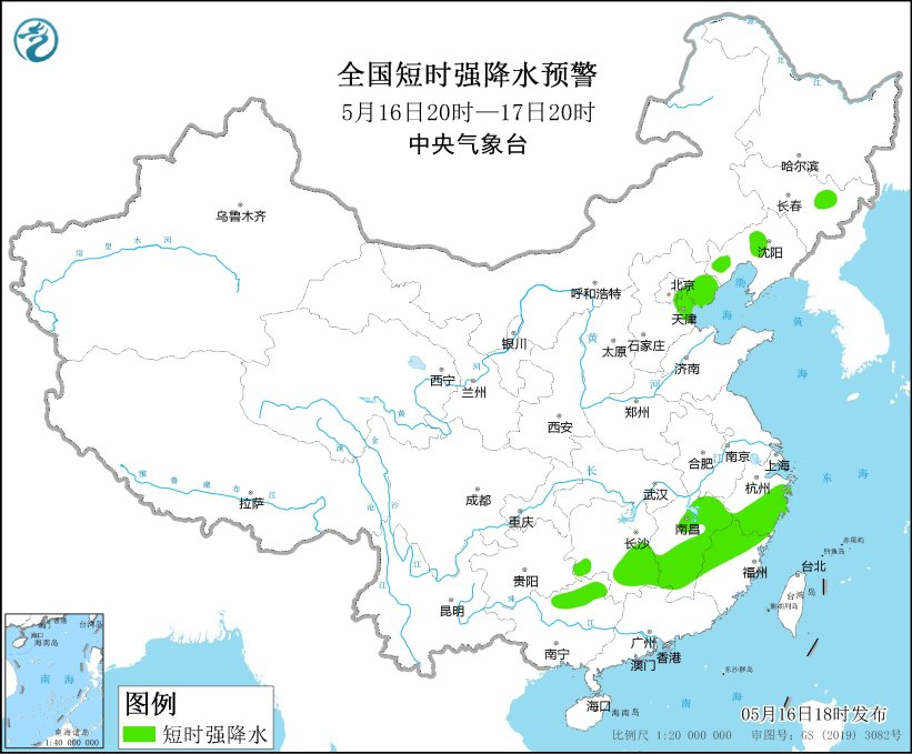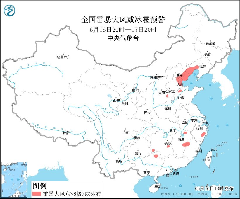 预计5月16日20时至17日20时,辽宁中西部、河北东北部及其近海、北京东南部、天津、山东北部、江西中北部等地的部分地区将有8-10级雷暴大风或冰雹天气;吉林东部、辽宁中部和西部、河北东北部、北京东南部、天津、浙江中南部、福建北部、江西大部、湖南南部、广西北部等地的部分地区将有短时强降水天气,小时雨量20-40毫米,局地可达50毫米以上。