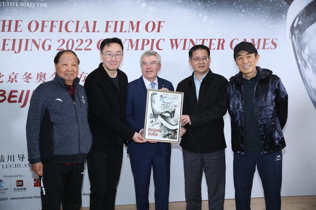 在观影活动中,北京冬奥组委专职副主席兼秘书长韩子荣向巴赫赠送了北京冬奥会吉祥物“冰墩墩”的兔年特别版“兔墩墩”。官方电影主创团队——担任影片策划的北京冬奥组委新闻宣传部部长赵卫东、监制张艺谋、总顾问张和平和导演陆川向巴赫赠送了官方电影海报。