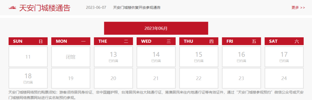 另外,天安门城楼未授权任何第三方机构或个人代理门票业务,请务必通过官方预约渠道“天安门城楼参观预约”网站(网址:www.)或“天安门城楼参观预约”微信公众号进行实名制预约。市民游客可预约次日起7日内门票,选择参观时段进行预约,无当日票及现场售票。每个参观日,参观时间内每人限预约1次。