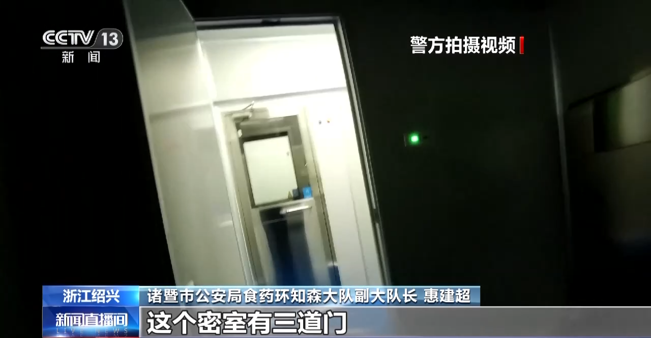 诸暨市公安局食药环知森大队副大队长 惠建超:根据嫌疑人的交代,直接到北侧二楼的一个密室里面,这个密室有三道门,都要经过指纹锁、密码锁。到了这个实验室以后,我们根据汤某的交代,在实验室里面,他利用之前学习的一些冻干技术,对司美格鲁肽原料进行配制。