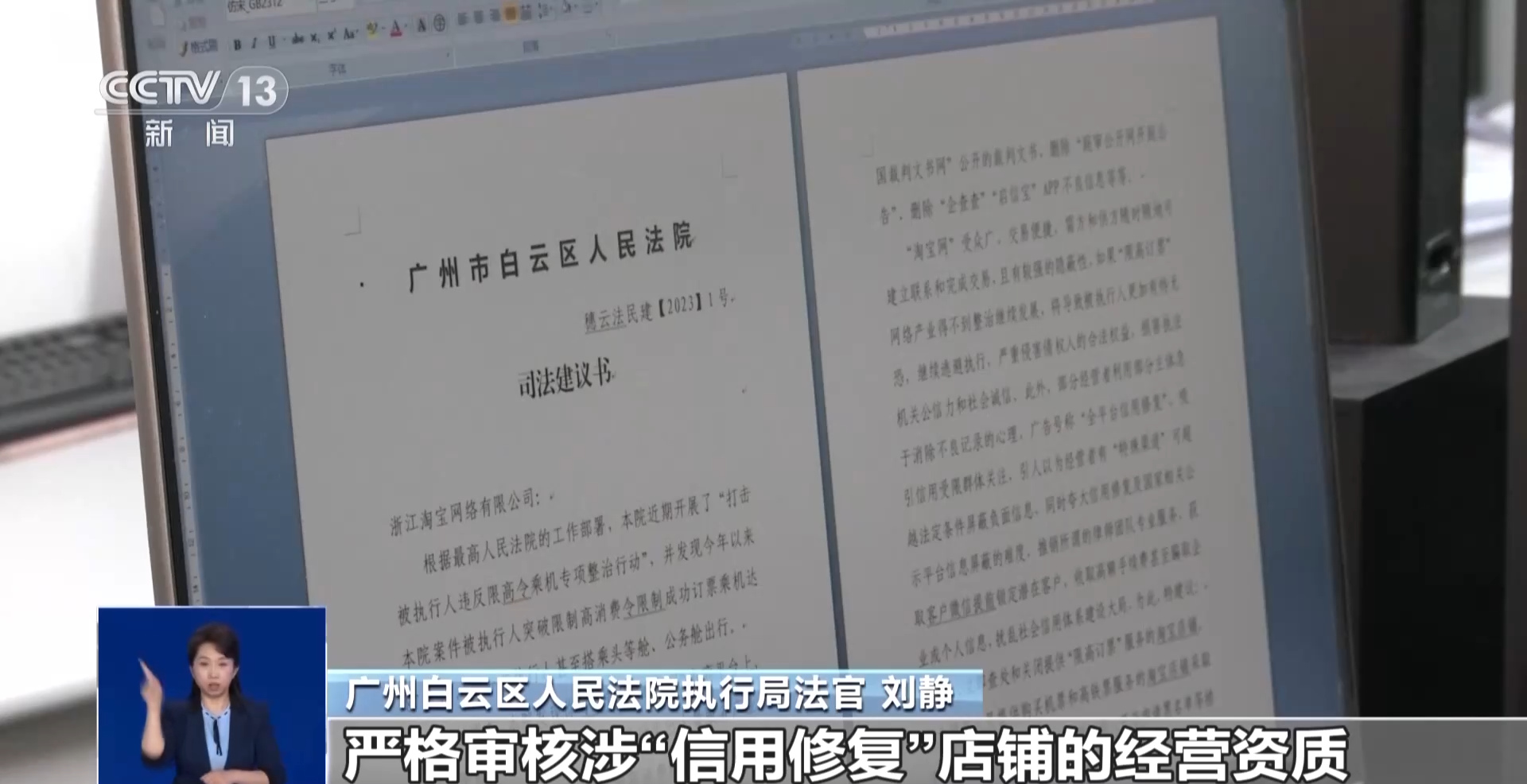 广州白云区人民法院执行局法官 刘静:主要就立即整改下架“限高订票”商铺,严格审核涉“信用修复”店铺的经营资质,屏蔽违规关键词,严格审核清理违规广告,加大常态化巡查监控力度等五个方面给出了具体的建议。