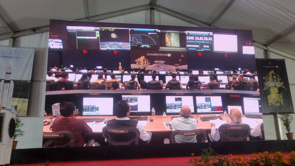 2023年8月23日,在印度班加罗尔,一处大屏幕播放印度月球探测器相关直播画面。新华社发