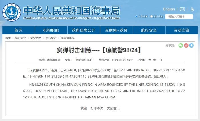 据中国海事局网站消息,清澜海事局发布航行警告,自2024年8月27日6时至20时,在南海部分海域进行实弹射击训练,禁止驶入。