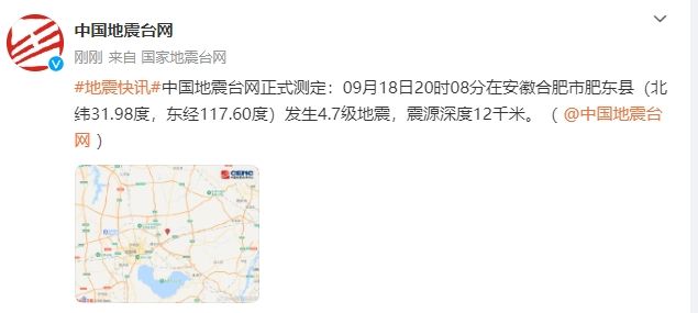 中国地震台网正式测定:9月18日20时8分在安徽合肥市肥东县(北纬31.98度,东经117.60度)发生4.7级地震,震源深度12千米。
