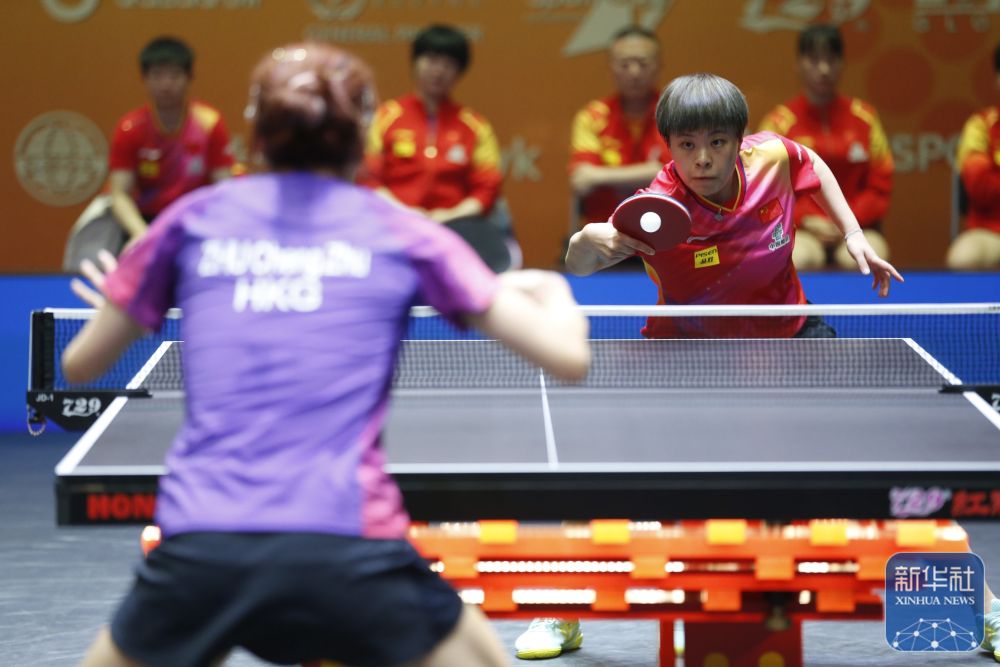 ↑中国队选手孙颖莎(右)在比赛中回球。最终,她3比0战胜中国香港队选手杜凯琹。