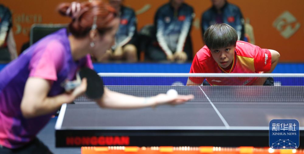 ↑中国队选手孙颖莎在比赛中回球。最终,她3比0战胜中国香港队选手杜凯琹。