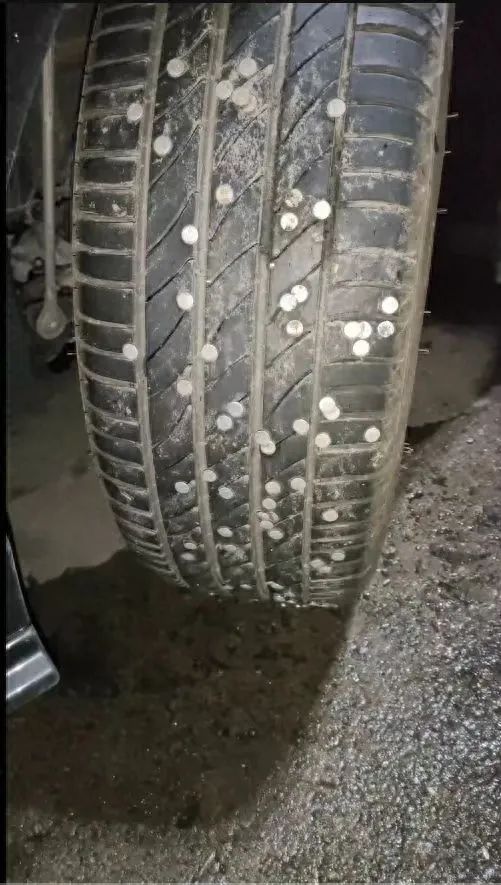 10月6日,有网友反映,在沪渝高速忠州服务区附近,有多车被钉子扎胎,甚至有的一个轮胎上就被扎了几十颗钉子,提醒大家注意行车安全。