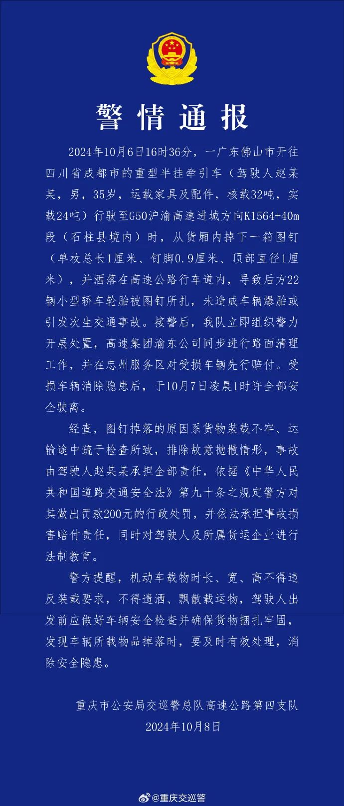10月8日凌晨,@重庆交巡警 发布警情通报:10月6日16时36分,一广东佛山市开往四川省成都市的重型半挂牵引车行驶至G50沪渝高速进城方向K1564+40m段(石柱县境内)时,从货厢内掉下一箱图钉,并洒落在高速公路行车道内,导致后方22辆小型轿车轮胎被图钉所扎,未造成车辆爆胎或引发次生交通事故。经查,图钉掉落的原因系货物装载不牢、运输途中疏于检查所致,排除故意抛撒情形,事故由驾驶人赵某某承担全部责任。