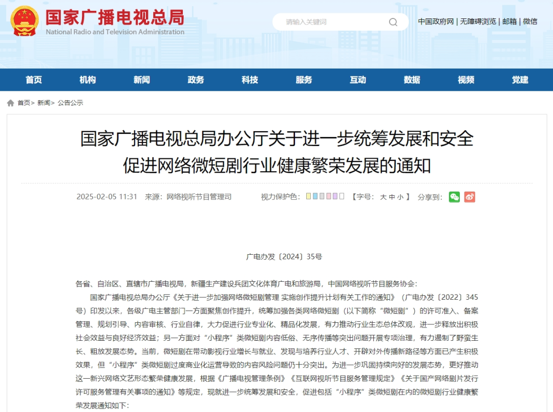 2月5日,国家广播电视总局发布《关于进一步统筹发展和安全促进网络微短剧行业健康繁荣发展的通知》,要求落实“分类分层审核”制度。根据微短剧行业发展实际,按照国产网络剧片分级监管、重点监管原则,对微短剧按三类分三个层级进行审核管理,以差异化、精准化管理优化审核流程、提高审核效率。