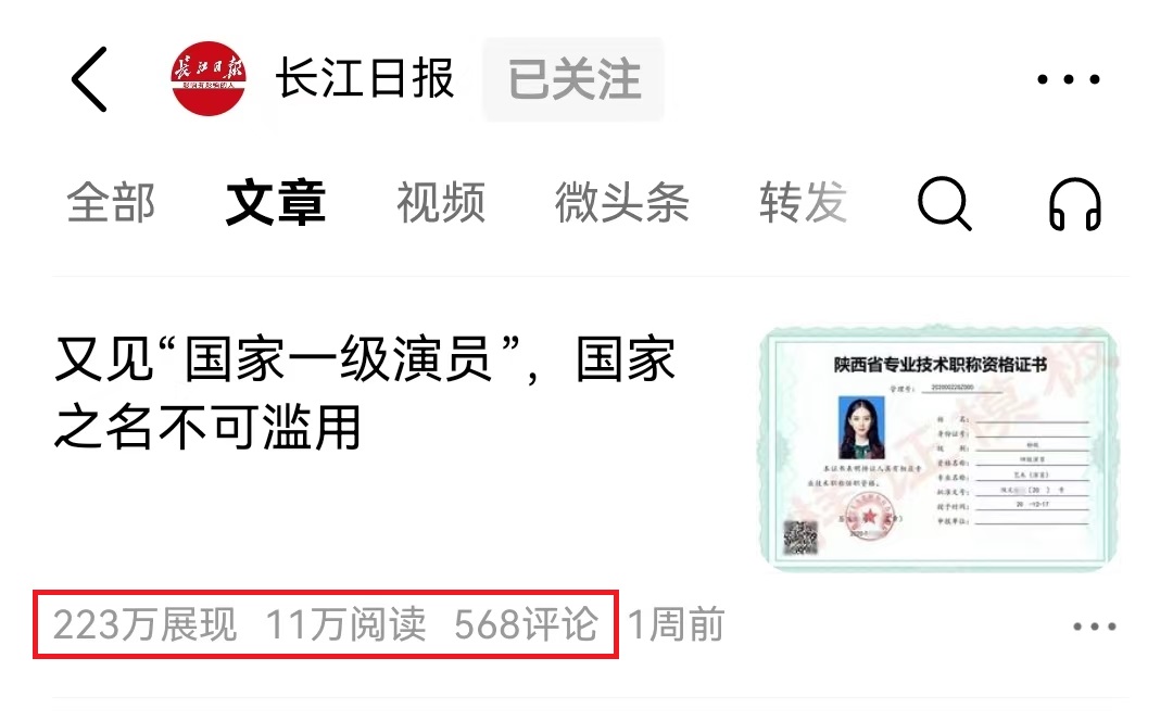 2月9日,长江日报大武汉客户端刊发的一文《又见“国家一级演员”,国家之名不可滥用》引发广泛社会关注,“中国晚协”公众号、中国江西网、中国宁波网、西安新闻网、湖南广播电视台都市频道“芒果都市”公众号、“编采圈”公众号等转发。