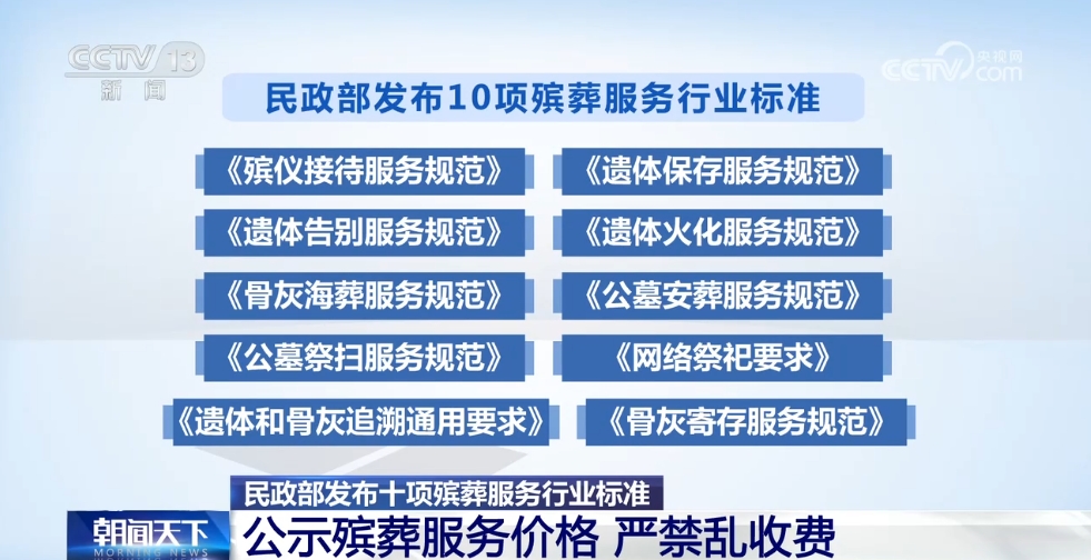 十项殡葬服务标准要求,遗体接运、存放、告别、火化、安放(葬)等各环节的服务项目、收费标准、商品价格应当公开公示,不得以任何名义强制提供高价服务或附加项目,签订服务协议前需逐项说明项目收费,避免诱导消费。