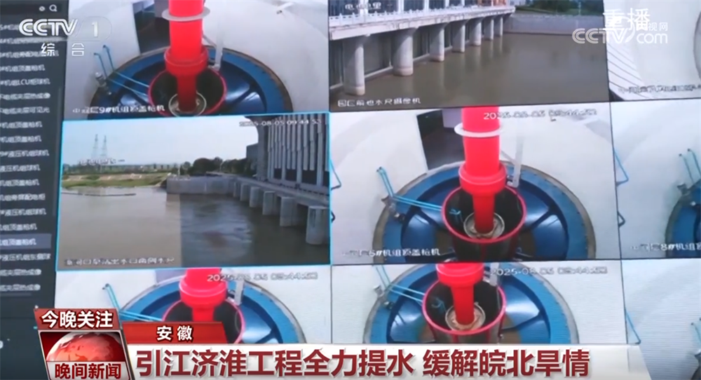 为缓解皖北旱情,引江济淮工程24小时不间断向淮河流域调水。位于合肥市肥西县的引江济淮工程派河口泵站,9台立式全调节轴流泵已开启7台,湍急的河水正在源源不断从菜子湖提至派河。