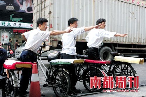 人力单车在厚街老华润商场门口拉客,厚街的士起步费按15元计,这使得便宜的人力单车有了载客市场。摄影_孙炯