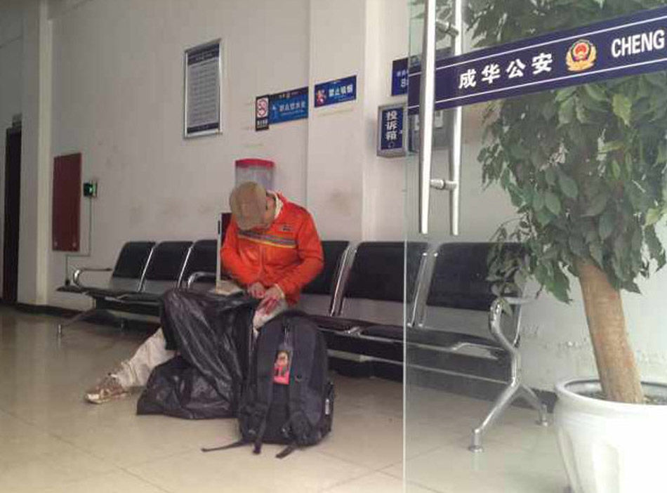 记者来到成华区青龙警署,在办公区域内,这名男游客戴着帽子坐在椅子上,全身发抖。记者注意到,男子的橙色衣服和白色裤子,已经裂开了许多洞,衣裤上有红墨水、血迹。他的身旁,有一个黑色背包。警方称,男游客身上有抓伤,需要送医治疗。12时40分,416医院的救护车驶来,男游客上车后来到416医院急诊室。在清创缝合室,医护人员对男子的伤口进行了包扎。医护人员称,男子的腿部、手部均有抓伤,并建议其注射狂犬疫苗针。成都商报记者看到,男子背部和四肢身上有16处伤,全是圆孔状。