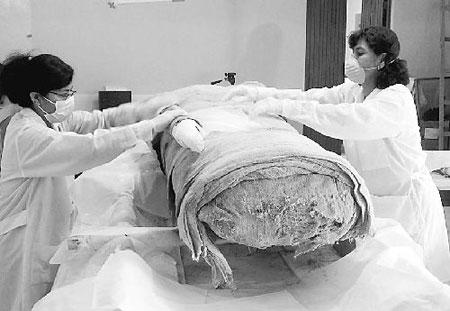 1972年,为了修建一座防空洞,中国建筑工人在长沙马王堆挖掘时发现了西汉时期的贵夫人车大女士的墓室。这名车大夫人是西汉初期长沙国丞相利仓的夫人。她死时,大量珍贵物品随其一同下葬:乐器、漆器,陶器、食品,药材,衣物、帛画以及数十个木制仆人和卫兵。车大夫人的尸体是迄今发现的保存最完好的湿尸。其面容清晰可辨,头发光鲜,皮肤湿润,肌肉有弹性,内脏器官完好。考古学家现在正想方设法弄清楚是墓室的设计还是某种古代防腐处理技术使她保存得如此完好。(图片来源:资料图)