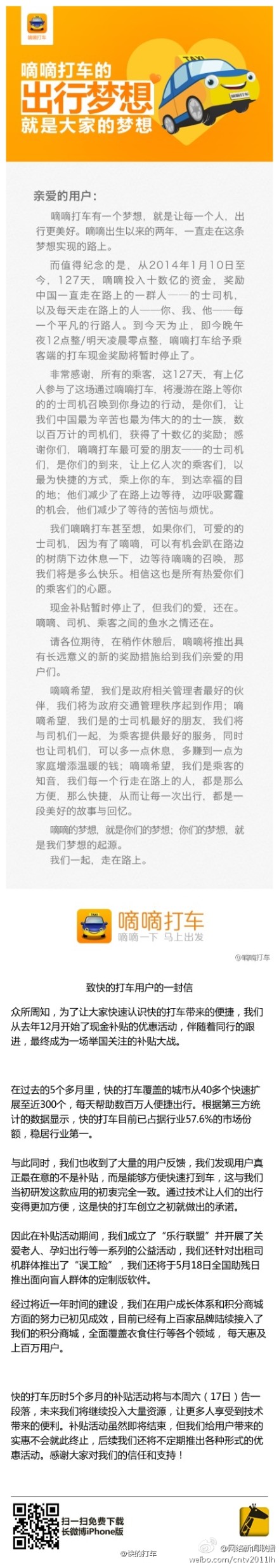 快的打车和嘀嘀打车16日下午在各自官方微博上同时宣布,将于5月17日停止对乘客的现金补贴。