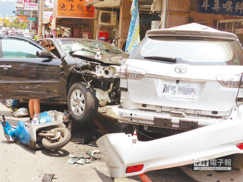 台中市1辆轿车昨失控撞上路旁9辆机车及3辆轿车,1名摩托车骑士死亡,现场惨不忍睹。 台湾《中国时报》图
