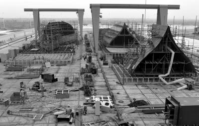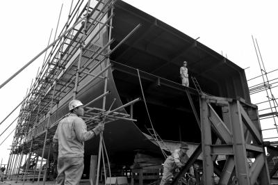 7月19日上午,丹东港造船平台上,数十名工人正在进行致远纪念舰的施工作业。主管复制舰建造工作的丹船重工生产部部长孙守林向京华时报记者介绍,自己今年2月份接到建船通知,经过产前准备、生产设计等流程,于5月5日正式开始施工。为了赶在9月17日(“大东沟海战”爆发日)之前完工,纪念舰制造工作已投入200多人,工期紧迫。