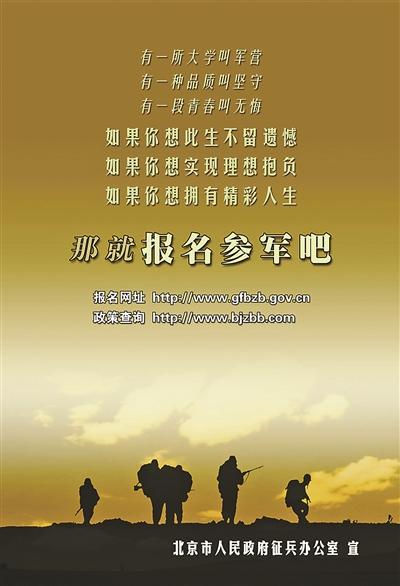“征兵已经开始啦,欢迎踊跃报名!”“如果你想此生不留遗憾,如果你想实现理想抱负,如果你想拥有精彩人生,那就报名参军吧!”这些清新活泼的宣传标语都来自今年的北京市征兵宣传挂图,让人耳目一新。