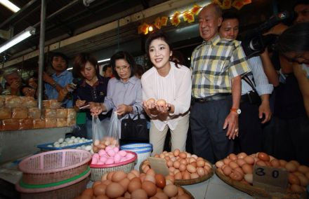 英拉到菜市场探访民众时,穿裸色雪纺衬衫搭配米白色长裤,脱下西装的英拉显然更亲民。
