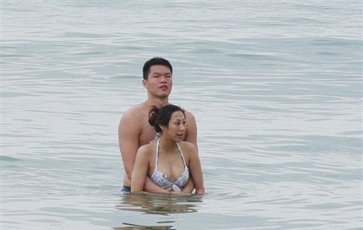 资料图片:朱芳雨与疑似“小三”的女子在海中拥抱。