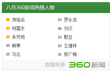 新华网北京9月10日电 据360新闻数据显示,在2014年8月最受关注的十大新闻人物中,因涉毒被拘的房祖名与柯震东高居前两位,卷入出轨风波的篮球国手朱芳雨位列第三。其他入选的还有因《后会无期》而被持续关注的韩寒,新晋中国首富马云,与王自如激辩三小时的锤子科技创始人罗永浩,二审被依法判处死刑的刘汉,低调访华的世界著名影星憨豆,致力打造万达电商的王健林以及中国海军首位女发言人邢广梅。