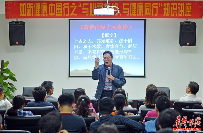 16日晚,96258·如新“与心灵相约、与健康同行”知识讲座开讲,养生专家、湖南中医药大学第一附属医院教授李定文现场分享养生秘诀。 记者 李健 摄