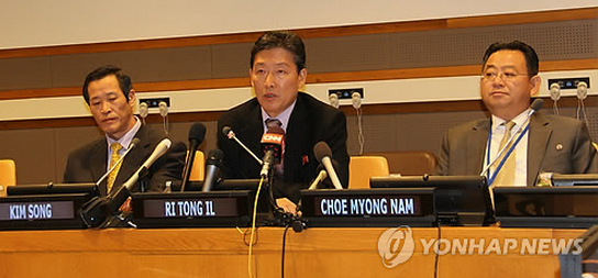 朝鲜驻联合国代表团参赞金城(音)(左一),朝鲜驻联合国副代表李东日(中)、以及朝鲜外务省国际事务副局长崔明南(右一)参加了说明会(网页截图)