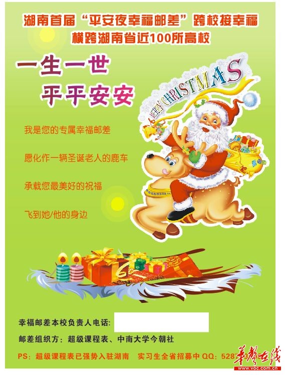 华声在线12月26日讯(记者 李毅) 12月24日是西方节日平安夜,随着近年来中西文化的融合,平安夜圣诞节在我国也逐渐流行。为了迎合这一新潮也颇具意义的西方节日,朱子礼、郭海兵、唐友强等人联合全省百余高校和校区共同策划了这起全省高校平安夜互送活动。