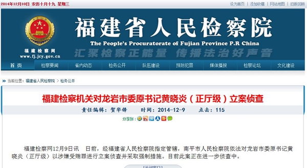 新华网福州12月10日电 据福建省人民检察院发布消息,日前,经福建省人民检察院指定管辖,南平市人民检察院依法对龙岩市委原书记黄晓炎(正厅级)以涉嫌受贿罪进行立案侦查并采取强制措施。