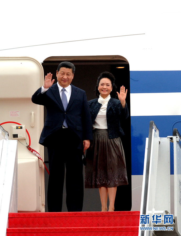 12月19日,中共中央总书记、国家主席、中央军委主席习近平乘专机抵达澳门,将出席庆祝澳门回归祖国15周年大会暨澳门特别行政区第四届政府就职典礼。这是习近平主席和夫人彭丽媛走出机舱时向欢迎人群挥手致意。新华社记者 张金加 摄