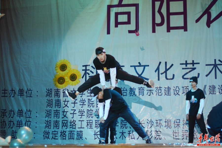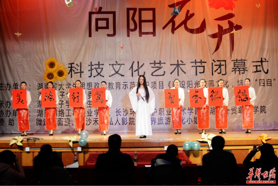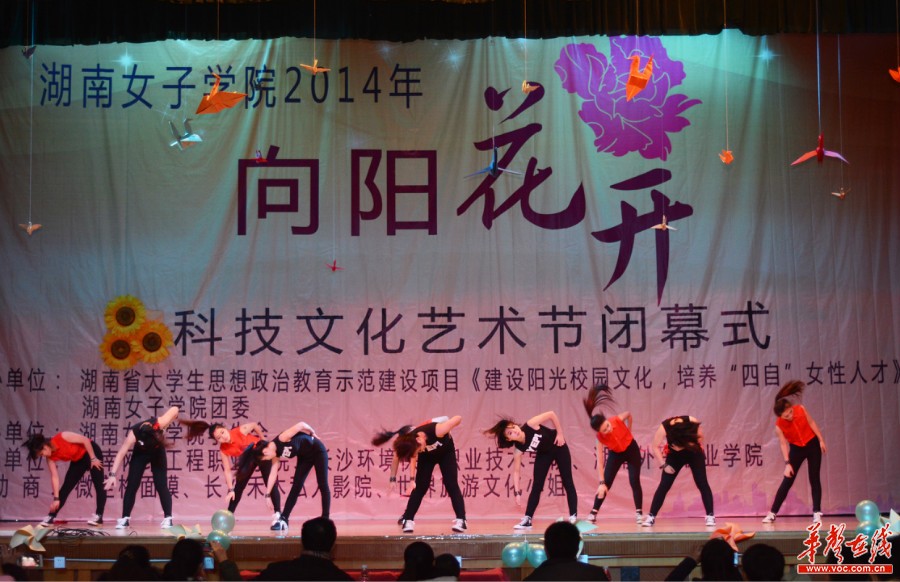 华声在线12月15日讯(记者 唐俊 李毅 谭云涛) 15日晚,湖南女子学院科技文化艺术节暨“向阳花开”元旦晚会在校体育馆精彩上演。在晚会现场,来自省内其他高校的男生们目睹了湖南女院“懿德睿智,笃行臻美”的女生风采。