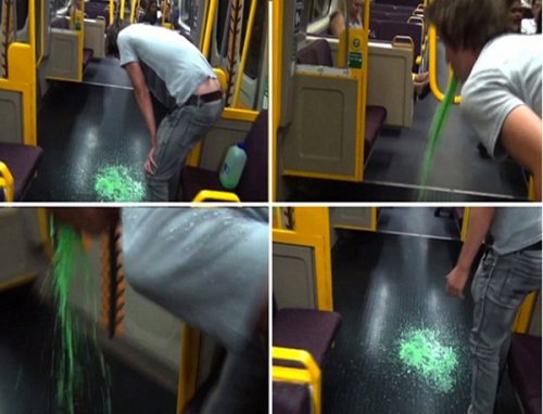 据报道,视频显示,这位20岁的男子在列车上,断断续续地吐出了绿色的液体——其实这些液体只是被他用食物染色剂处理过的牛奶。