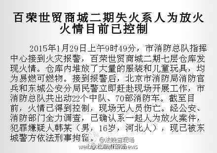 【#百荣起火#竟是人为纵火,16岁嫌疑人被刑拘】昨天上午9时许百荣商城冒烟,直到今天下午1时许,起火仓库仍在阴燃,浓烟不断。公安消防部门调查确认系人为放火,16岁嫌疑人韩某(男,河北人)被刑拘。消防部门称,起火处货多,火源中心240°达到消防头盔融化临界点,内部攻克困难。(记者 石爱华)