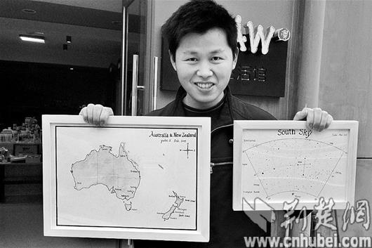 他从小就对神秘星空产生了极大的兴趣,大学毕业后便四处奔走去看星星。这几年,他爱上手绘星空图,最近,他将手绘的20余幅星空图在硚口区一个文化产业园做了个小型展览。他希望,让静谧的星空去抚平更多现代人内心的躁动。