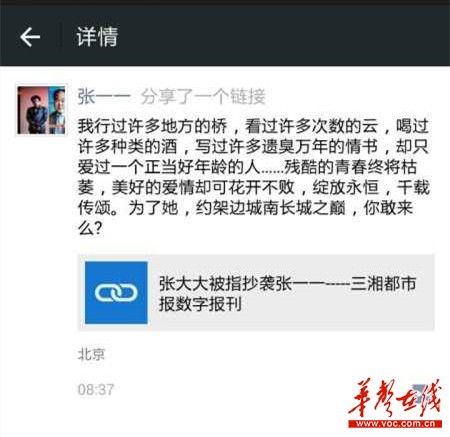 华声在线讯 近日,“张大大被指抄袭张一一”一事愈演愈烈。早日,湖南卫视主持人张大大在个人微博上公开发表一篇《致翠翠》的博文,迅速爆红网络,被网友们誉为“最美情诗”。而后,内地作家张一一却表示《致翠翠》疑似抄袭他的《致不朽的柏芝》。今日事件继续发酵,张一一在微信上再次给予回应,悍然声称“为了她,约架边城南长城之巅,你敢来么”。