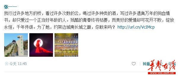 随后,11时许,张一一又在腾讯微博上发布约架博文,并配上了“中国南方长城”一图为约架地点。面对张一一今日的挑衅,张大大目前没有作出任何回应。关于事件的后续发展,记者将及时追踪报道。