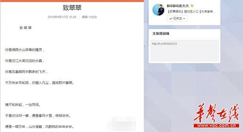 张大大情诗示爱凤凰女子 被指抄袭张一一