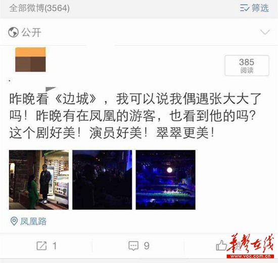 《致翠翠》全文376字,文辞优美华丽,情感朴素真实,文末署名“2015年春张大大于凤凰”,张大大爱慕的到底是《边城》小说中的翠翠,还是另有其人?记者调查发现,或与凤凰古城新近推出的大型实景演出《边城》有关。