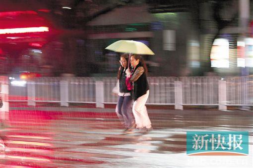 昨天,两位女士在积水中行走。新快报记者 祝贺/摄