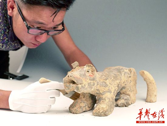 华声在线—三湘都市报讯 6月10日,考古专家在修复首次从汨罗市友谊河边战国古墓出土的“镇墓兽”。这尊猪脸牛身的兽型陶器距今有2000多年,出土后兽身红色、白色漆彩依稀可见。汨罗市文物管理所所长赵磐介绍说:“镇墓兽放在墓穴随葬,用来为墓主人驱邪、看家护院的,是当时的一种丧葬习俗。”据介绍,镇墓兽是楚墓特有的陪葬品,也是楚彩绘陶器中造型独特的器物之一,具有鲜明的地域特征与时代特征,具有重要的考古研究价值。记者 徐典波 通讯员 周敏 摄影报道