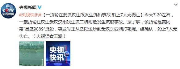 人民网北京8月14日电 据中央电视台新闻中心官方微博消息,今天7时30分左右,一艘货轮在汉江武汉汉阳段江汉二桥附近发生沉船事故。据了解,该货轮是黄冈籍“昌盛9889”货船,事发时正从岳阳运沙到武汉东西湖打靶堤。经确认,船上7人无伤亡。